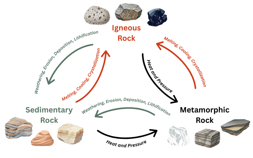 The classification of a rock is based on the processes that affect the rock’s chemical and physical properties. The rock cycle is the continuous process by which rocks are formed, altered, and transformed through geological mechanisms, resulting in the creation of three primary rock types: igneous, sedimentary, and metamorphic.