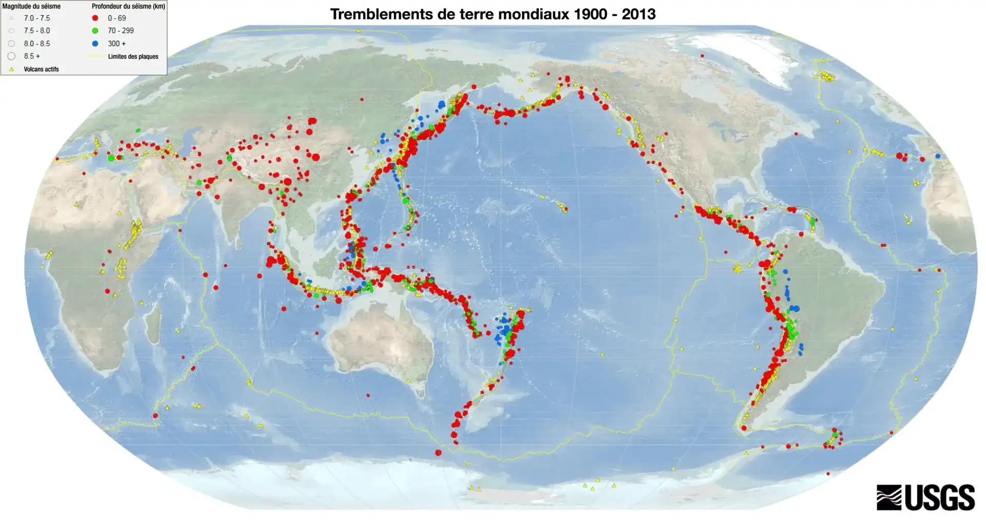 Comme illustré ci-dessous, la ceinture de feu du Pacifique est naturellement délimitée par cet enregistrement de l’activité volcanique (jaune) de l’United States Geological Survey, ainsi que par les tremblements de terre (du rouge au vert puis au bleu selon la profondeur) depuis plus d’un siècle. Les couleurs chaudes indiquent des séismes peu profonds (rouge=<69 km de profondeur dans la Terre), tandis que les couleurs plus froides indiquent des séismes plus profonds (bleu=300+ km de profondeur dans la terre). La taille des cercles indique l’amplitude relative des tremblements de terre. (Cliquez sur la carte pour l’agrandir.)